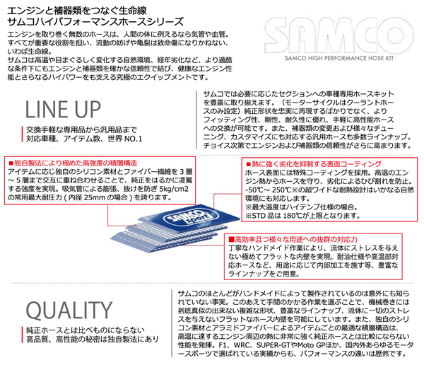 ■サムコハイパフォーマンスホースシリーズは高温や目まぐしく変化する自然環境、経年劣化など、より過酷な条件下にもエンジンと補器類を確かな信頼性で結び、健康なエンジン性能とさらなるハイパワーをも支える究極のエクイップメントです。